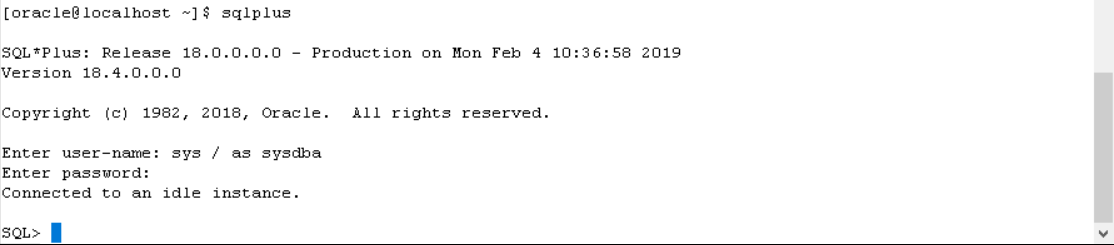 Iniciamos sesión con el usuario sys a través de sqlplus, lo hacemos con el siguiente comando: